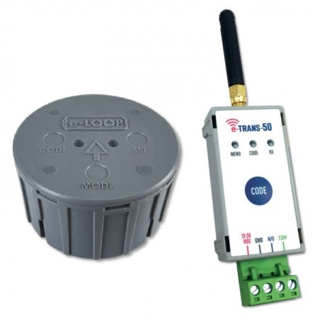 Kit détecteur Magnetometrique pour la détection de Presence de véhicule e-LOOP Inground, transmetteur radio 433.39MHZ à encastrer Cryptage AES 128 bits, auto-Calibrage, fonctionne avec 1 pile lithium 3,6 Volts / 14500 mA (autonomie jusqu'à 6 ans), Dimensions Diamètre 88 mm, Profondeur 55 mm, indice de protection IP68, charge statique max 10T, diamètre de détection maximal du magnétomètre 1.5m, fourni avec récepteur e-TRANS-50, mémoire jusqu'à 50 codes, Alimentation 10 V à 36 Volts Ac/Dc (cons. 4.5mA), 1 Sortie Relais NO (24 Volts / 1 A) Présence et impulsion, antenne intégrée.